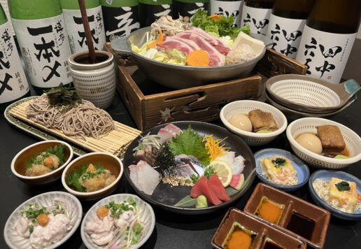 10月11月限定コースは当店名物の五島直送ごまさばや旬のお刺身の盛り合わせ、糸島産の豚角煮に加え、いちじくと秋ナスのクルミソースがけ、メインにはキノコと秋刀魚のつみれ鍋をご堪能頂けます。秋が旬の食材をふんだんに使った、まさに秋を感じる事が出来るメニューを盛り込んだ必食のコースをご用意しました。締めにはつるっとした喉越しが特徴の五島うどんをご用意しております。